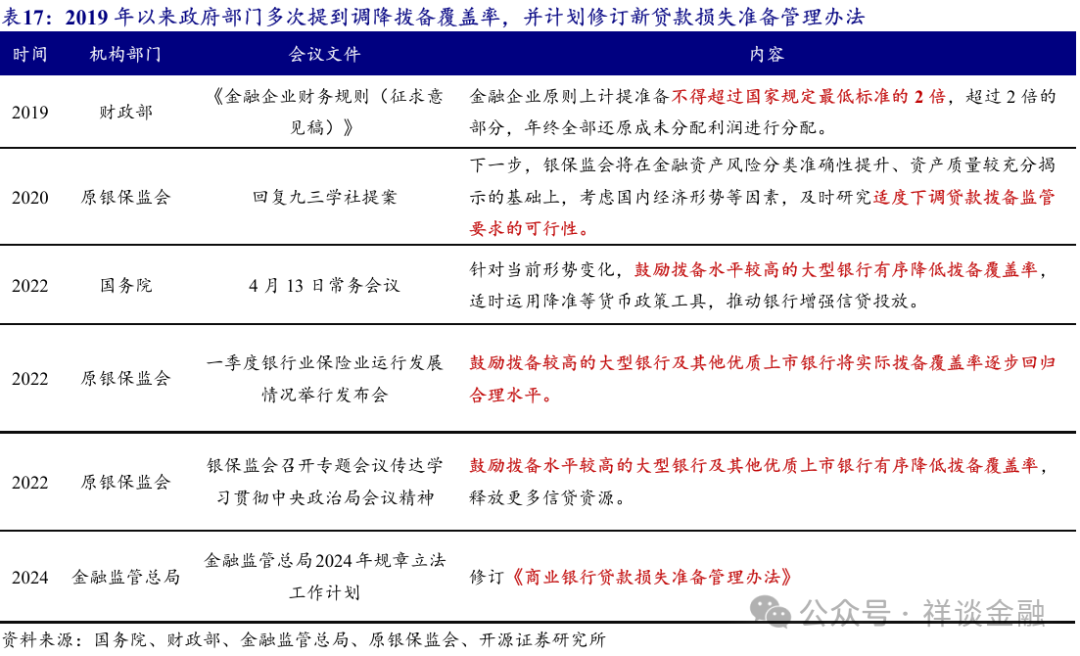 监管层面亦有调降拨备的可能迹象。2019年财政部发布《金融企业财务规则》修订稿并公开征求意见,其中要求“金融企业原则上计提准备不得超过国家规定最低标准的2倍,超过2倍的部分,年终全部还原成未分配利润进行分配”。该文件至今虽未正式发布,但仍表明财政部调降商业银行拨备的态度;2020年至2022年间,国务院及监管亦多次提及下调拨备覆盖率,鼓励拨备水平较高的大型银行有序降低拨备覆盖率;此外,金融监管总局2024年规章立法工作计划中已明确对《商业银行贷款损失准备管理办法》修订。