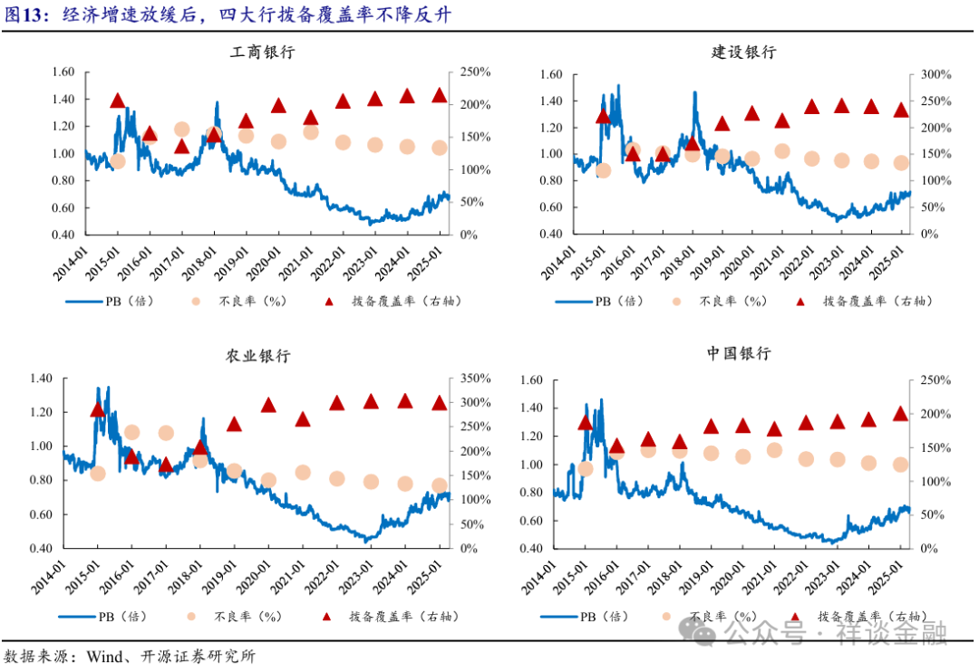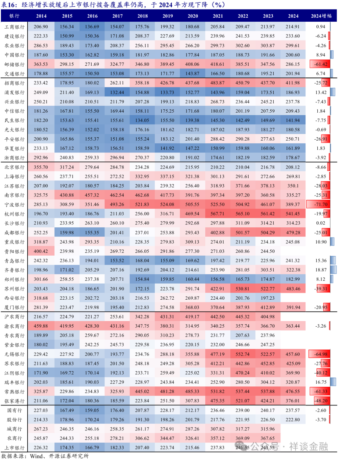 我国于2011年正式建立动态贷款损失准备调整制度,2018年新金融工具准则实施将减值损失计提方法由“已发生损失法”修订为“预期损失法”,上述均体现了监管前瞻性计提拨备的要求。2012年起我国经济增长动能有所调整,GDP增速自2000年来首次滑落至8%以下,商业银行营收增长同步承压,期间银行股估值逻辑经历了盈利驱动估值分化—风险扩散后估值收敛—红利推动估值提升的演变。当前商业银行零售业务风险虽有所抬升,但对公业务风险较前期大幅缓解,不良率整体呈下降趋势。与此同时拨备覆盖率仍处高位,这与经济放缓时期银行可适当少提拨备的经营思路相背。逆周期拨备动态调整机制作为稳增长政策的组成部分,未来或仍有发力空间,商业银行拨备覆盖率、拨贷比等指标存在下调及差异化监管可能。上市银行2024年拨备覆盖率总体下降,但大小行分化明显:国有行拨备覆盖率降幅有限,贷款减值损失却同比减少;部分农商行拨备覆盖率大幅下调,但新增拨备计提同比超50%。故银行拨备覆盖率下降并不意味会形成盈利贡献,通过拨备释放利润的能力亦不仅取决于拨备绝对水平的高低。