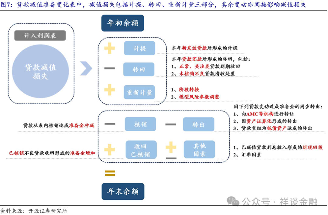 贷款减值损失由计提、转回和重新计量三部分构成。计入贷款减值损失的部分由构成如下:1、当期计提:指当年新发放贷款所形成的减值准备计提,由于新发放贷款形成关注和不良较少,故该部分主要由规模因素主导;2、当期转回:当年因贷款还款所形成的准备金转回,包括正常类贷款到期收回,以及对到期未归还贷款(逾期、不良贷款)的清收;3、重新计量:因贷款阶段转换、模型参数调整等因素导致的计提或回拨。