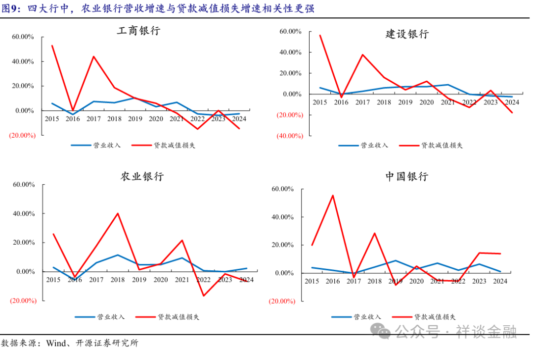 主动调节拨备的佐证:营收与贷款减值损失变动相关性强。以四大行为例,2015年起四大行营收增速变化趋势一致,但贷款减值损失增速变化存在差异,例如2021年四大行营收增速略有回升,工行、建行、中行同期拨备仍少计提,但农业银行当期拨备计提力度大幅增加。四大行中,农业银行拨备计提趋势与营收变化相关性更强,故通过拨备调节的可能性更高。