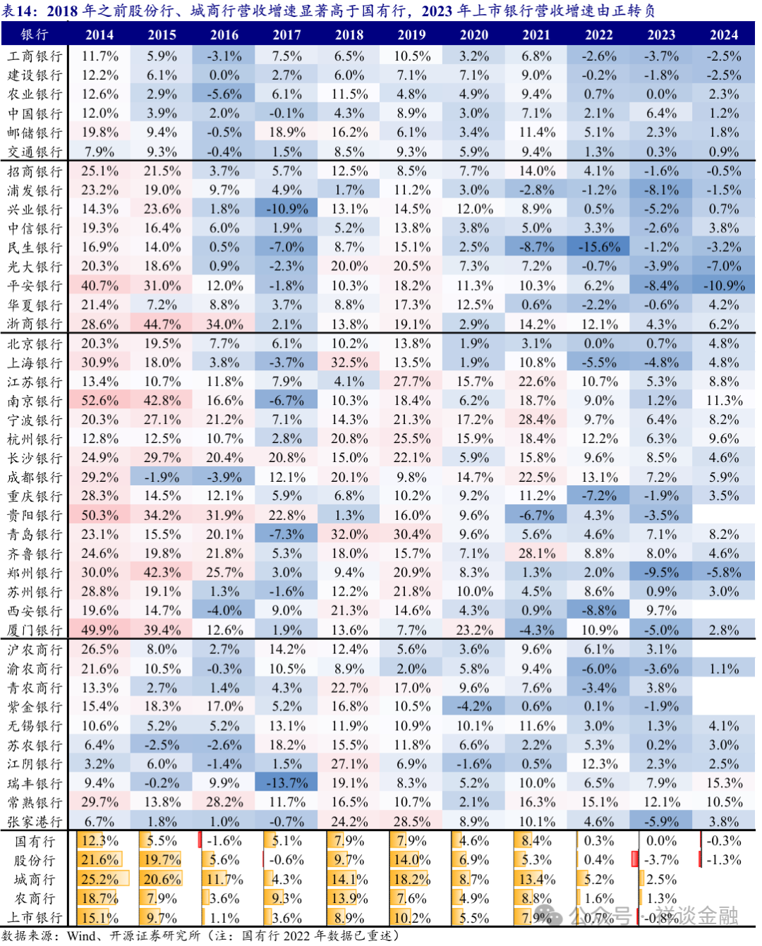 阶段一:2018年以前,盈利驱动估值分化。该阶段我国经济增长虽放缓,但上市银行经营仍有韧性,股份行零售及财富业务发力、城商行区域优势突显,营收增长显著高于国有行。盈利驱动下各类行估值分化显著。