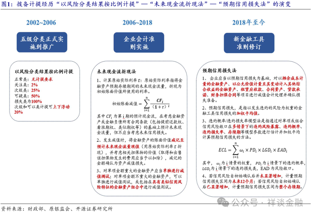 我国拨备制度的变迁,同步于贷款风险分类制度的变化。自2002年信贷风险分类由“一逾两呆”转变至“五级分类”后,监管口径拨备计提主要依据《贷款损失准备金计提指引》,即按照风险分类结果按比例计提(关注类2%,次级类25%,可疑类50%,损失类100%,其中次级和可以类计提可上下浮动20%)。同时2006年财政部发布了《企业会计准则》与国际会计制度接轨,明确采用未来现金流折现法计提减值准备。