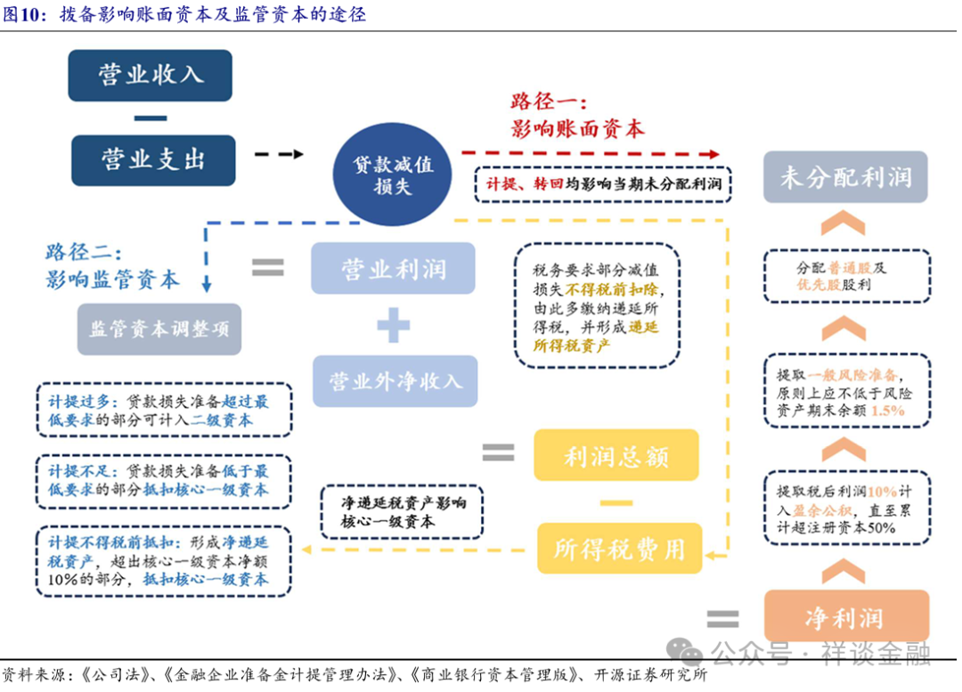拨备影响账面资本及监管资本。拨备对资本的影响有两方面:第一、拨备提取、转回均影响净利润,对留存收益形成冲击,影响账面资本;第二、在计算各级资本充足率时,拨备水平与监管调整项有关,如超额损失准备会计入二级资本;若拨备计提不足,以及净递延税资产超出核心一级资本净额10%的部分,将形成核心一级资本扣除项目,影响资本指标。
