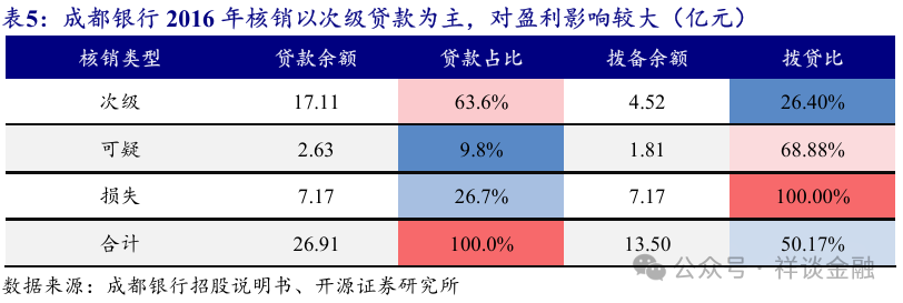 例如成都银行2016年核销贷款共计26.9亿元,其中次级、可疑、损失类贷款占比分别为 63.6%、9.8 %、26.7%,三类贷款计提拨贷比分别为26.40%、68.88%和100%。核销前贷款已共计提减值准备13.5亿元,需补提贷款减值损失13.4亿元。成都银行当年核销主要为次级贷款,需大幅补计提拨备,影响当期盈利(2016归母净利润yoy为-8.5%),次年增速录得51.6%大幅回升。成都银行于2017年底A股上市,该核销策略或出于降低基数突出上市后首份业绩的考虑。