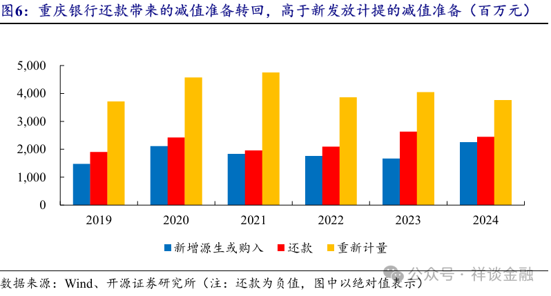 新发放贷款拨备计提增加主要由规模驱动。重庆银行披露计提、还款、重新计量三项数据,历史上因还款形成的减值准备转回,均高于新发放贷款形成的计提,重新计量因素仍占据主导。此外2024年新发放贷款形成的计提较2023年有所增长,但这并不意味资产质量的变化,主要仍受规模因素驱动(如新投放贷款和当年到期贷款同步增多)。