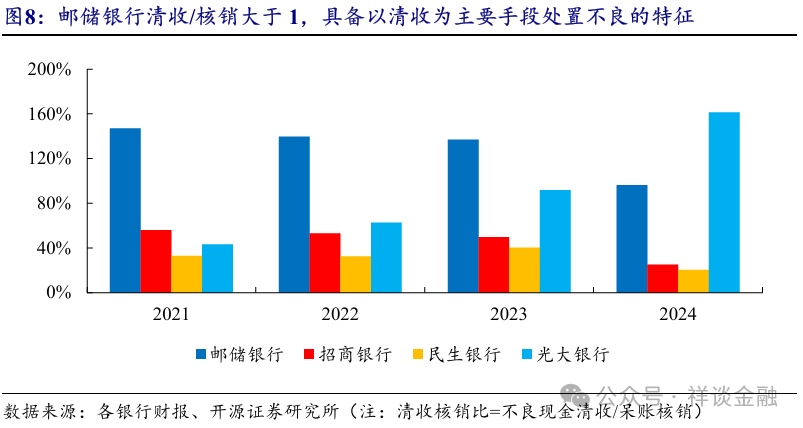 邮储银行不良资产处置行为或代表国有行整体倾向。部分银行年报中详细披露了不同方式处置不良资产的规模,最常见的是清收与核销。我们用清收/核销衡量银行两种方式下处置不良资产的相对力度,比率大于1说明不良处置以清收为主,邮储银行明显具备此特征。