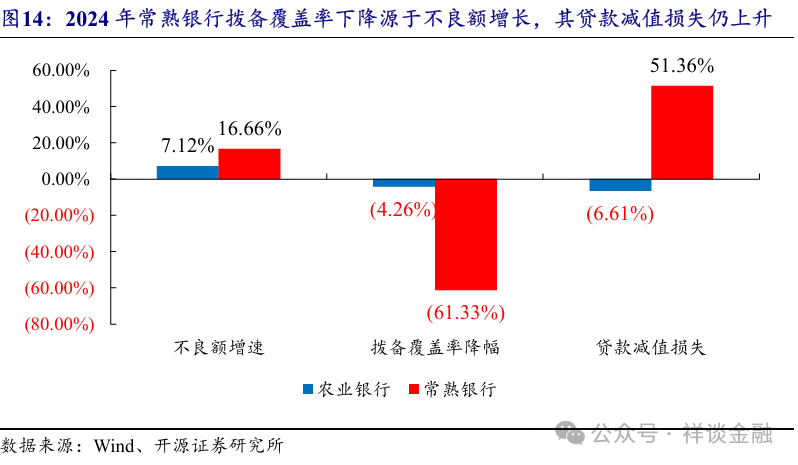 调降拨备覆盖率不等同于释放业绩。2024年部分、城农商行拨备覆盖率大幅下降,但贷款减值损失反而拖累盈利,其下降原因主要来自分母不良贷款的增长。例如2024年常熟银行拨备覆盖率下降61.33pct,但其贷款减值损失同比增51.4%,对盈利形成拖累,受零售风险上行影响,常熟银行2024年不良额增速为16.7%,在上市银行中居前。与此对比,国有行中,农业银行2024年拨备覆盖率下降4.26pct,贷款减值损失同比降6.6%形成业绩贡献,其不良额增速为7.1%亦低于常熟。