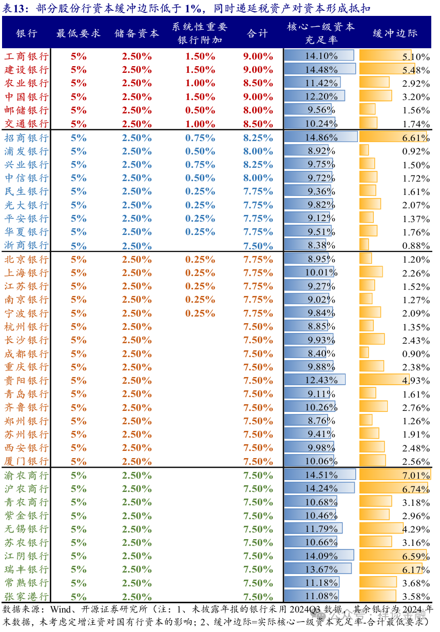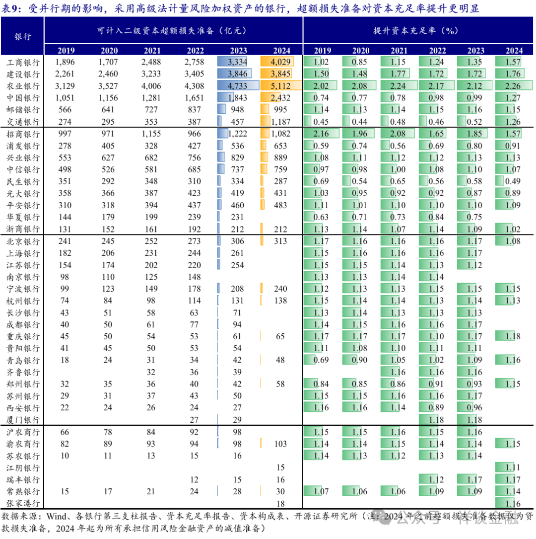 资本新规实施后国有大行超额损失准备提升明显,股份行受非贷损失准备拖累。新资本办法实施之前(2024年之前)超额损失准备仅含贷款,2024年起开始包含所有承担信用风险的金融资产。观察到2024年实施高级法的五家国有行,其超额损失准备对资本充足率贡献幅度均上升,其中交行提升幅度最大为74bp。而实施高级法的股份行(招行),超额损失准备的贡献幅度下降了28bp。我们认为国有行超额损失准备的提升,一方面源于并行期要求对下非贷超额损失准备可计入部分更多;另一方面源于国有行对非贷资产减值准备计提相对充足。从披露数据的股份行来看,2024年大部分股份行超额损失准备规模较2023年增幅较小,部分股份绝对值出现下降(民生银行2023年超额贷款减值准备为334亿元,2024年超额损失准备为287亿元),这亦体现了股份行非贷资产损失准备计提相对不充分,拖累资本指标。