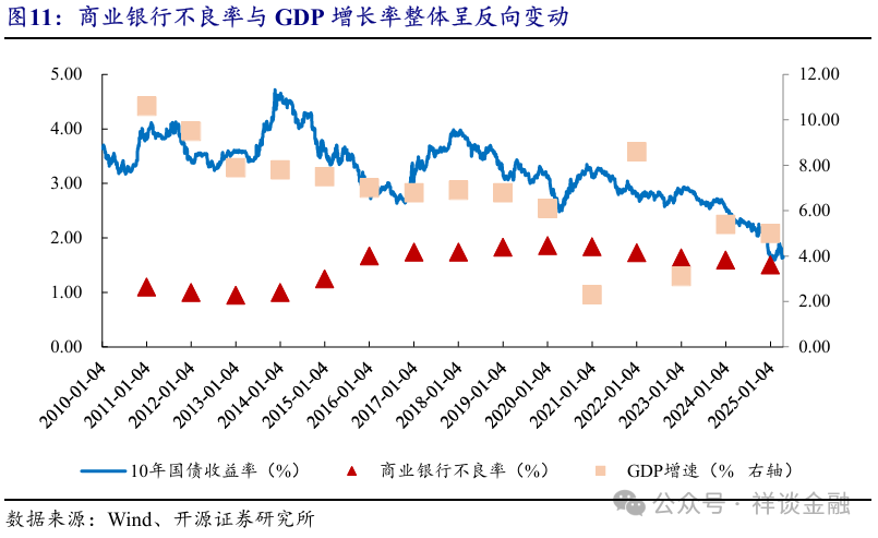 阶段三,2024年起,红利逻辑推动估值提升。该阶段上市银行营收增速仍处于底部区间,但自2024年初上市银行估值水平从底部反弹,国有行PB水平超过其他类型银行。一方面源于商业银行对公业务风险调控成效显现,对公资产质量改善显著;另一方面由于无风险资产(10年国债)收益率大幅下行,银行股的股息价值突显,红利逻辑下国有行估值持续修复。