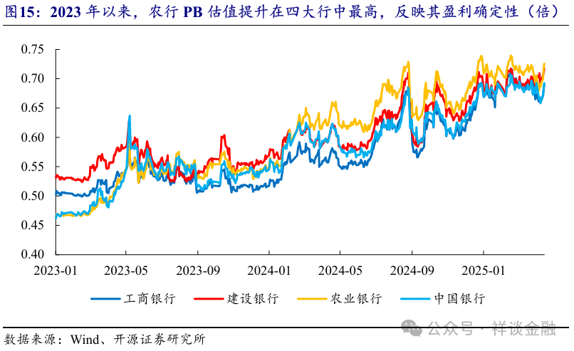 市场表现亦反映拨备带来的盈利确定性。2023年以来农行PB估值由四大行最低上升至最高水平,主要源于拨备释放空间充足,对应未来盈利确定性较强,股息稳定强化其红利逻辑