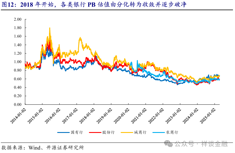 阶段二,2018至2024年,风险扩散后估值收敛。2018年起市场对商业银行风险担忧升温,尽管期间商业银行积极调整信贷调整,加大不良清收处置,但由于传统行业清退以及不良清收核销的过程均漫长,故风险处置的成效于2021年方体现,商业银行不良率由高位逐步下降。银行在该阶段营收、盈利增长均放缓,但拨备覆盖率仍保持上升趋势,市场仍担忧银行不良资产发生损失后对净资本的侵蚀,各类行PB水平均下行破净,估值趋于收敛。