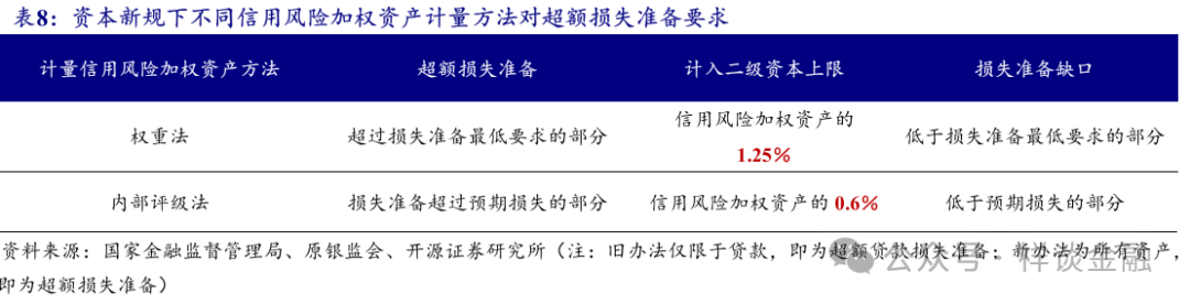 超额损失准备规则有利于实施资本计量高级法的银行。新资本管理办法框架下,采用权重法、高级法(内部评级法)的银行,其可计入超额损失准备的上限分别为信用风险加权资产的1.25%和0.6%。尽管权重法下超额损失准备上限更高,但采用高级法的银行适用于至少三年的并行期要求,期间高于不良资产余额的1.5倍的超额损失准备可全部计入二级资本(低于部分仍适用上述规则)。受此影响,建行、农行、招行等采用内评法的银行,其超额贷损失准备对资本充足率的提升幅度更明显,上述三家银行2024年末超额损失准备对资本水平的提升分别为1.76%、2.26%和1.57%。