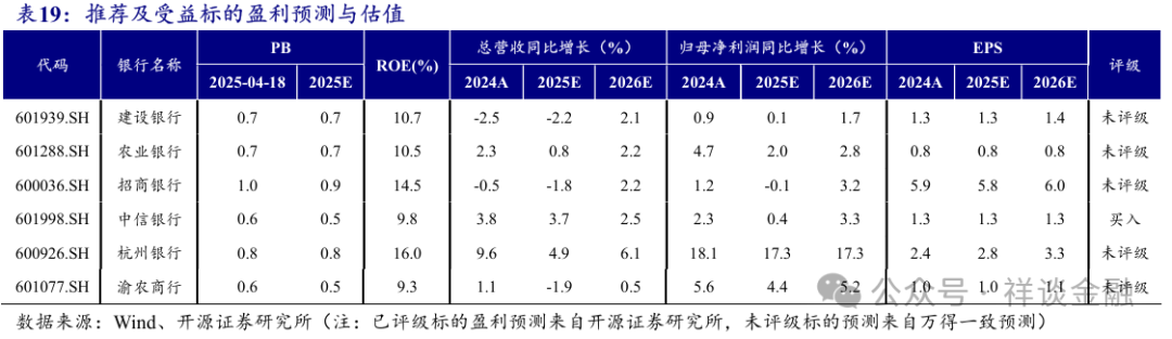 基于上述逻辑,我们认为国有行兼具拨备释放基础与拨备调节的能力,逆周期拨备动态调整机制赋予拨备以丰补歉的作用,未来国有行盈利增长具有较高确定性,预计当前30%的分红比例可稳定保持,红利策略可持续性强化,受益标的农业银行、建设银行。此外资本视角下部分股份行,城、农商行拨备释放亦有较大空间,推荐中信银行,受益标的招商银行、杭州银行、渝农商行。