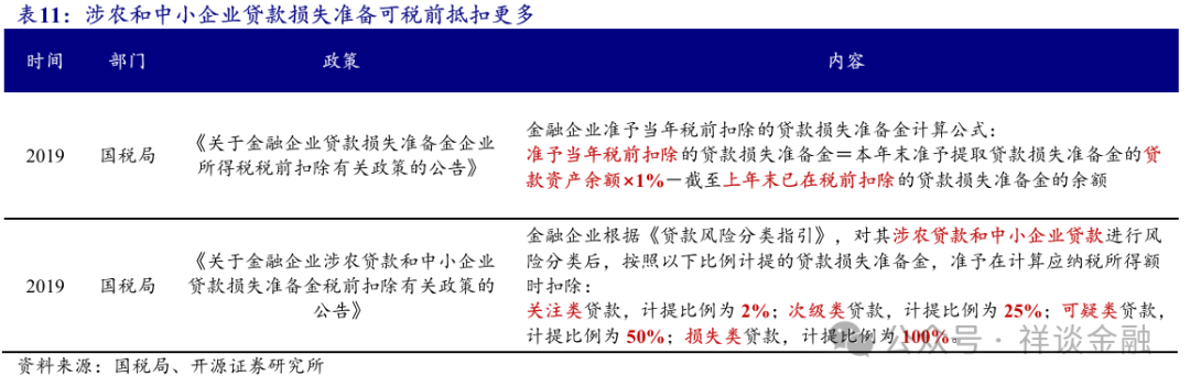政策支持下,涉农、小微企业计提损失准备可税前抵扣更多。当前税收政策下,涉农和中小企业贷款依据风险分类,关注、次级、可疑、损失类贷款分别按2%,25%,50%和100%计提的损失准备可税前扣除;非上述贷款损失准备金可扣除限额为对应贷款余额的1%。