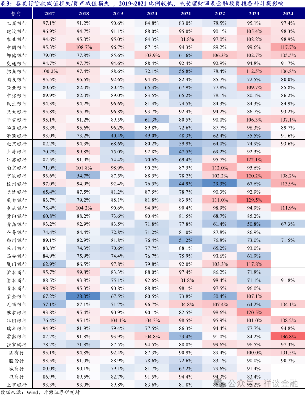当前拨备计提压力主要来自信贷,非贷类资产影响有限。预期信用损失法下,信用减值损失由贷款和非贷资产构成。2019~2021年期间,部分股份行及城商行贷款减值损失/资产减值损失比例相对较低,即非贷类资产拨备计提对减值损失影响相对较大,主要源于2018年资管新规发布后,表外理财面临回表压力,表外资产转回为表内金融投资,部分非标资产大幅补计提减值准备。随着资管新规整改结束,非贷资产拨备计提压力下降,信贷拨备计提重新占据主导。2022年之后部分银行贷款减值损失/资产减值损失大于100%,意味非贷资产减值损失当期净回拨,故当前商业银行拨备计提压力主要来自于信贷。