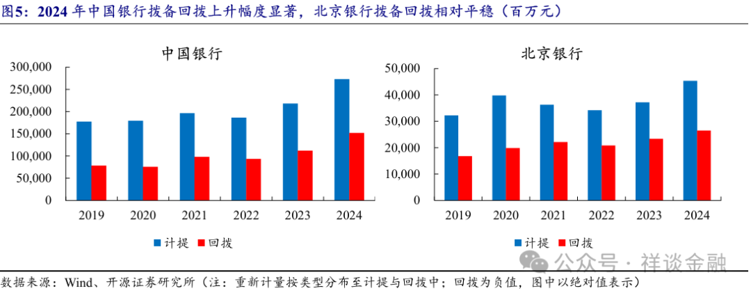 中国银行2024年转回显著上升或源于清收力度加大。大部分银行合并披露减值损失净计提数据,仅个别银行披露分项,如中国银行、北京银行将重新计量按类型分布至计提与回拨中,2024年中国银行减值准备回拨显著增长,对盈利的贡献更显著,或源于国有行在2024年加大了不良处置力度,清收不良资产形成回拨,同时正常类贷款到期因素亦有影响。