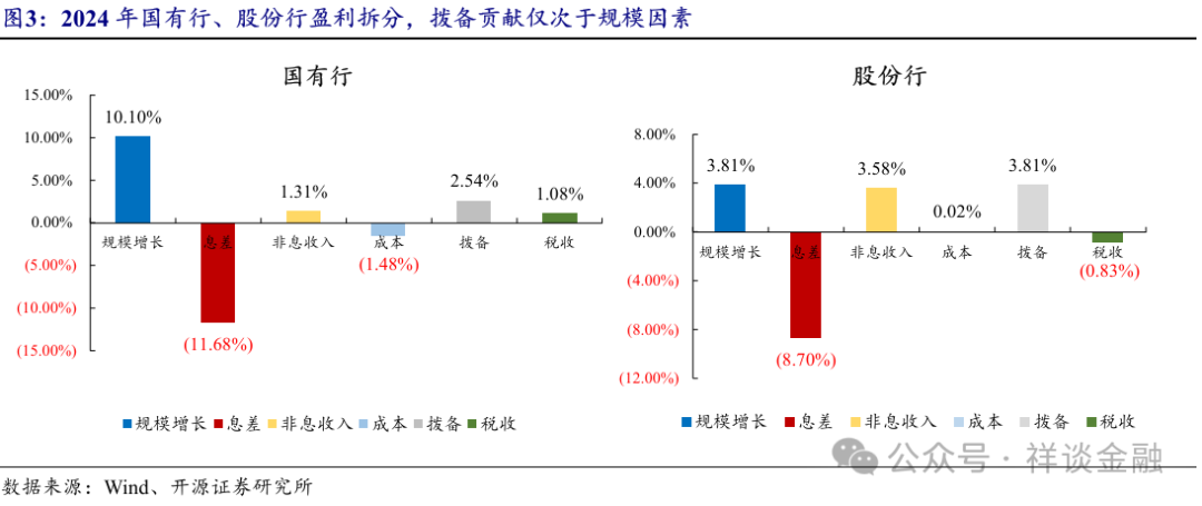 动态调整拨备机制建立后,拨备与贷款增速同步。预期信用损失法与拨备动态机制,均体现了监管前瞻性计提拨备的要求。引入前瞻性信息后,金融资产在初始确认时就确认其预期信用损失,银行估计贷款的违约概率(PD)、违约损失率(LGD)和违约风险暴露(EAD),计算不同权重的场景下预期信用损失的加权平均值。预期信用损失法要求金融机构在经济繁荣时期多计提拨备,提高未来风险抵御能力;在经济衰退时期少计提拨备,增加银行利润。2012年之前,拨备与贷款增速反向变动,动态拨备制度实施后,二者增速趋于同步。现阶段商业银行营收增速放缓,拨备对盈利的贡献愈发显著,2024年上市国股行拨备对盈利的贡献仅次于规模因素。