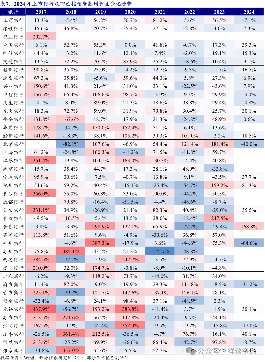2024上市银行收回已核销呈分化趋势。以国有行为例,2024年工商银行收回已核销同比降7.1%,中国银行同比增长39.3%,二者的差异,一方面源于银行清收能力,另一方面或源中国银行前期对核销资产的摆布,收回可能性更高的贷款被核销更多。此外,部分城、农商行收回已核销贷款规模亦有显著增长(青岛168.8%,瑞行40.1%),推测其亦通过核销资产的摆布实现拨备调节。