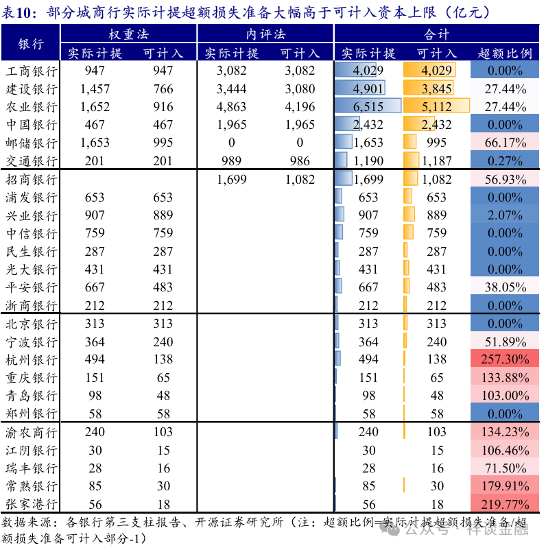 部分城、农商行拨备释放仍有较大空间。超额拨备计提行为差异亦存在于城、农商行间。如北京银行、郑州银行超额损失准备实际计提均等于可计入上限。我们认为银行按照上限计提超额损失准备,或源于超额损失准备对资本贡献最大化的管理目标(此时再增加损失准备计提、也无法计入资本)。另一部分银行(例如杭州、渝农)实际计提超额损失准备大幅高于可计入资本上限,资本视角下未来释放拨备反哺盈利空间仍充足。