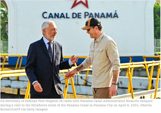 4月8日,美国国防部长皮特·赫格塞思(右)与巴拿马运河管理局长 Ricaurte Vasquez交谈