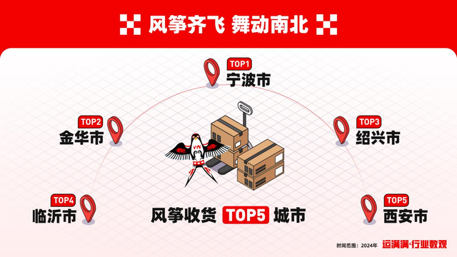 风筝消费市场印证了风筝文化的开枝散叶。在运满满平台上,2024年,除潍坊本地外,收货量前五城市为宁波、金华、绍兴、临沂、西安,放风筝作为一种大众文化活动在全国各地受到广泛欢迎。而在金华义乌“小商品之都”,潍坊风筝借助其物流与渠道优势走向了更广阔的市场。