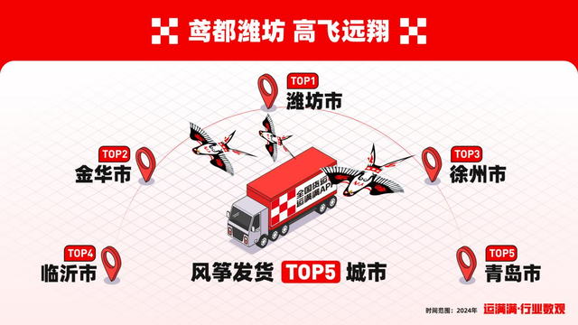 潍坊的风筝产业链已形成“文化IP—生产制造—全球消费”的闭环。运满满2024年数据显示,全国风筝发货量前五城市中,潍坊以数千吨的绝对优势占据榜首,金华、徐州、临沂、青岛分列其后。