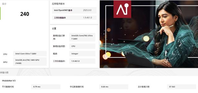 AI性能方面,UL Procyon CPU Integer算力评分240,相比上一代酷睿Ultra处理器提升了100多分,算力增强不少。
