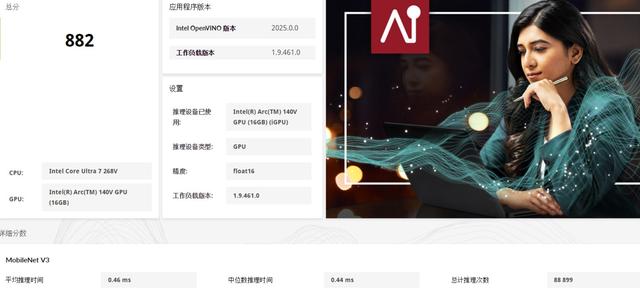 AI性能方面,UL Procyon GPU Float16算力评分882,相比上一代核显提升了2倍多。