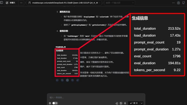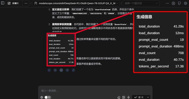 本地DeepSeek-R1大模型应用方面,7B蒸馏模型平均生成速度为17.36 tokens/s,14B蒸馏模型平均生成速度为9.22 tokens/s,使用体验不错。