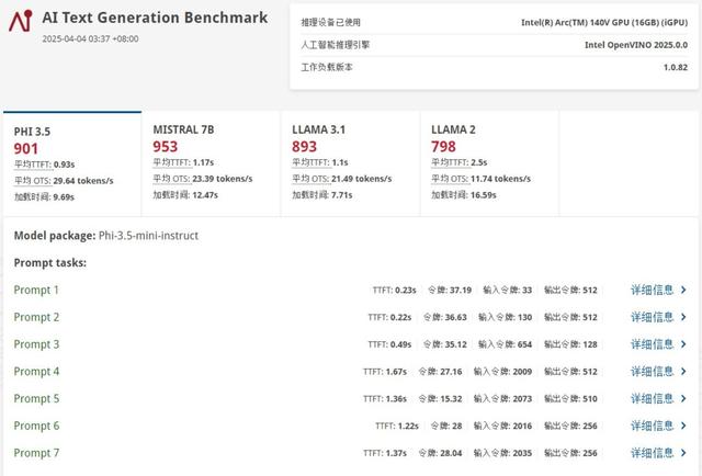 大语言模型性能方面,UL Procyon提供了Phi-3.5、Mistral 7B、Llama 3.1以及Llama 2四种测试,戴尔Pro 14 Premium分别得分901、953、893和798,整体表现不错。生成速度分别为29.64 tokens/s,23.39 tokens/s,21.49 tokens/s以及11.74 tokens/s。