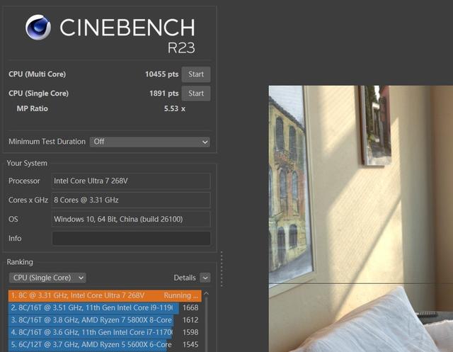 硬件配置方面,这款机器搭载了英特尔酷睿Ultra 7 268V处理器,这颗处理器为8核8线程设计,睿频加速最高5GHz,拥有12MB三级缓存,默认TDP为17W,最高TDP为37W。CINEBENCH R23单核性能1891,多核性能10455,满足日常办公应用没有问题。