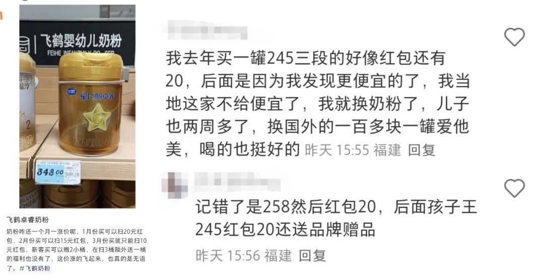 在某社交平台,多位消费者发文称,飞鹤旗下的高端产品星飞帆卓越扫码可获得红包,但红包数额从1月可获得20元,下降到2月的15元,3月份红包金额更是降到10元。此外,新客赠品及参与扫码额外赠送一桶奶粉的活动也取消了。