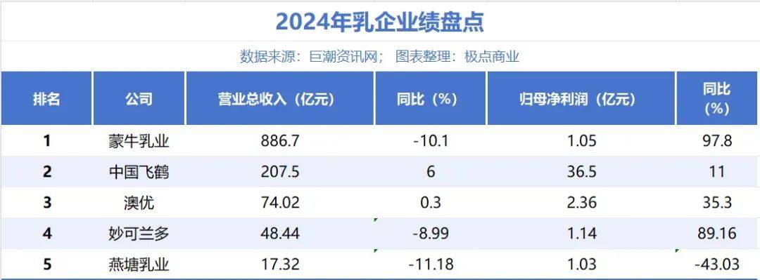 “极点商业”对飞鹤、蒙牛、燕塘乳业、妙可蓝多、澳优等已披露年报的乳企业绩进行了梳理。从财务数据上看,2024年飞鹤交出了一份行业少见的“双增长”成绩单。