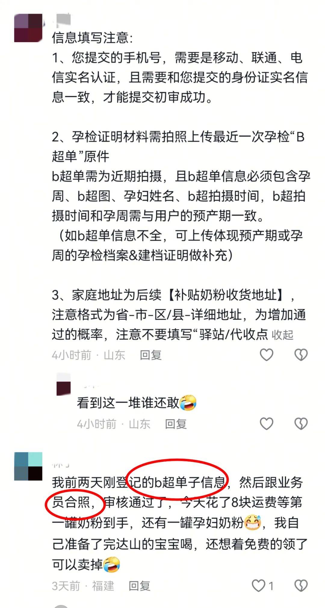 从多条评论中, 我们拼凑出了消费者需要提交的信息:初审时提交和身份证信息一致的手机号码;上传最近一次孕检的B超单原件,其中需包含孕妇姓名、B超拍摄时间、孕周数、B超图等详细信息;补充家庭地址。