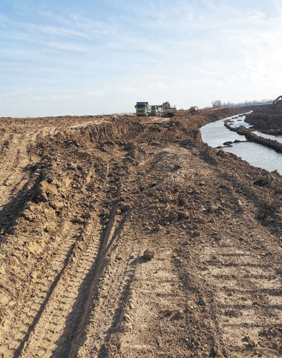 记者近日在现场看到,因深度开挖,小新沟赵寨村段河道拓宽,河面较上游邻村河段形成鲜明对比;河道以东,取土影响范围近20米,新形成的河堤上,取土车留下一道道车辙,还可以看见几株被碾倒的麦苗。