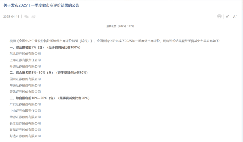 近日,全国股转公司发布了2025年一季度做市商评价结果。此次评价对象为2025年一季度开展做市业务的券商。根据《全国中小企业股份转让系统做市商评价指引(试行)》规定,12家做市商获得了做市交易经手费减免资格。