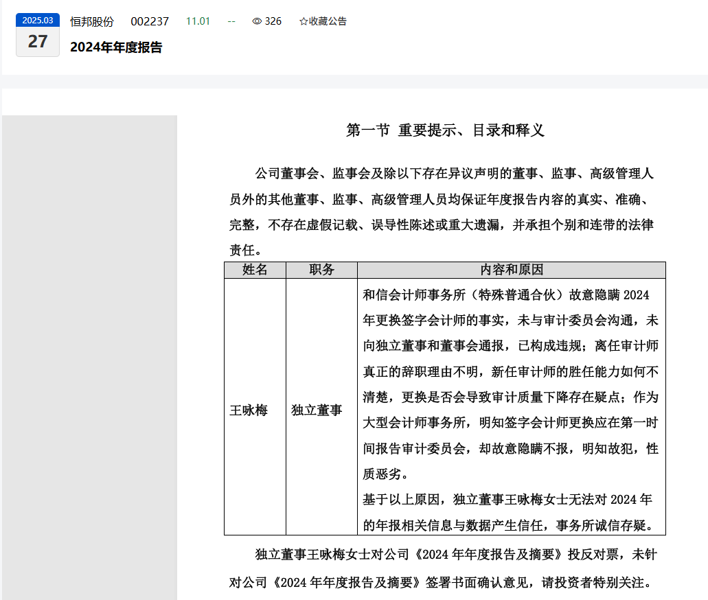 和信会计师事务所(特殊普通合伙)故意隐瞒 2024 年更换签字会计师的事实,未与审计委员会沟通,未向独立董事和董事会通报,已构成违规;离任审计师真正的辞职理由不明,新任审计师的胜任能力如何不清楚,更换是否会导致审计质量下降存在疑点;作为大型会计师事务所,明知签字会计师更换应在第一时间报告审计委员会,却故意隐瞒不报,明知故犯,性质恶劣。基于以上原因,独立董事王咏梅女士无法对 2024 年的年报相关信息与数据产生信任,事务所诚信存疑。