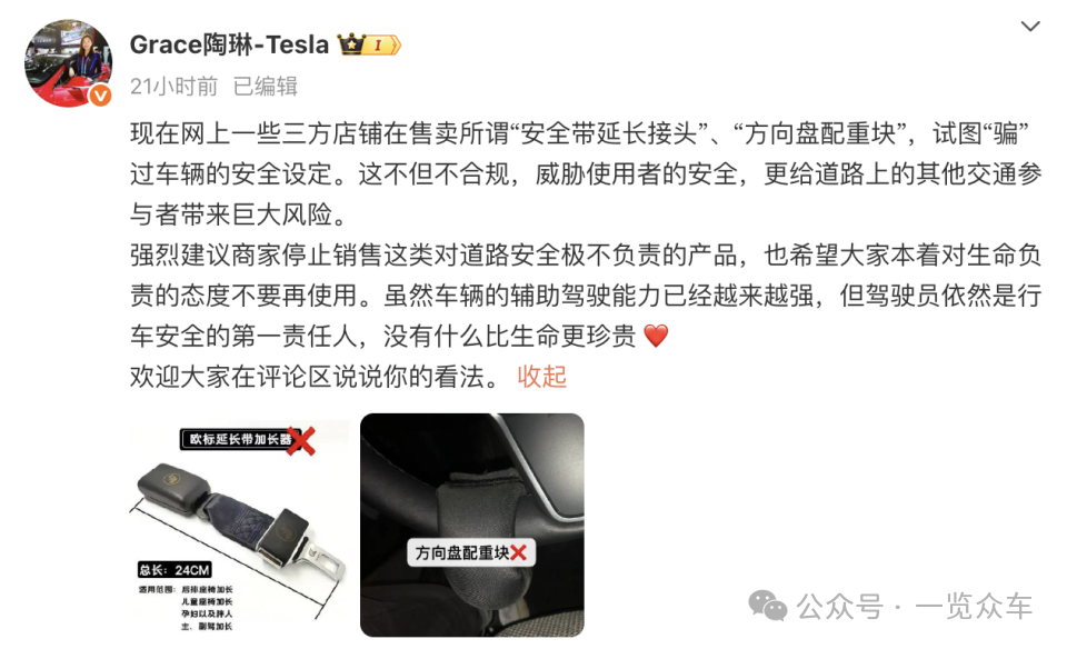 4月20日,特斯拉公司副总裁陶琳发文称,现在网上一些三方店铺在售卖所谓“安全带延长接头”、“方向盘配重块”,试图“骗”过车辆的安全设定。这不但不合规,威胁使用者的安全,更给道路上的其他交通参与者带来巨大风险。