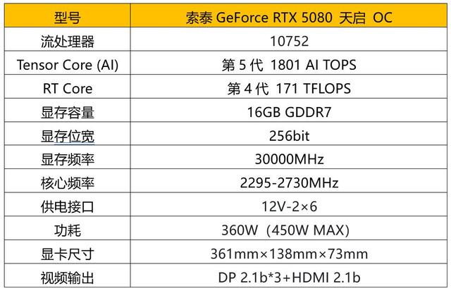 索泰RTX5080天启OC显卡全新升级的机甲风设计,在沿袭天启系列经典机甲设计的同时,通过白黑金三色的搭配,演绎出系列过往不曾有的优雅与精致;16GBGDDR7规格的高速率显存,能轻松应对AI训练以及创意工作流;旗舰级的堆料和供电设计,搭配上特挑的GPU核心,也成就了这张显卡不俗的超频表现;再加上优秀的温度和噪音控制,使得RTX5080 天启OC几乎做到了全方位无短板的“水桶型”显卡,对于追求极致体验的玩家与创作者而言,索泰RTX5080天启OC显卡无疑是一个非常不错的选择。