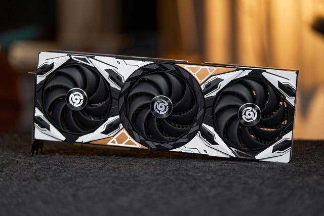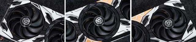 正面中央是三把直径10cm的高性能环刃风扇。扇叶末端增加了环形导流风罩,配合高强度的新型复合材质和优化后的叶片曲率,可以增加风扇的结构稳定性,降低风噪,并且提升风量和风压,让气流能够更有力地穿透散热鳍片,提升显卡的散热效率。另外风扇还支持智能启停,可提供更好的低载噪音表现和延长使用寿命。