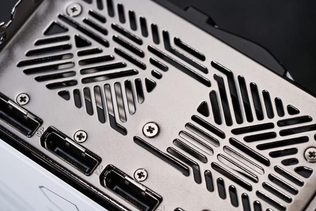合金背板一改前代的纯黑,变成了纯白设计,曾经的机械双翼花纹变成了右侧单翼,并在羽翼处处做了凸起来增强质感,用来构成贯穿风道的背部开孔也成为了单翼构成的一部分,相当巧妙。