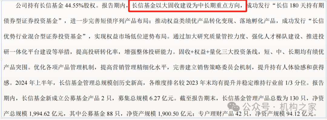 长江证券在其2024年的半年报中表示,“长信基金以大固收建设为中长期重点方向”,而从实际结果来看长信基金的固收类产品规模确实有所增长,并且带动公司管理规模不断新高。