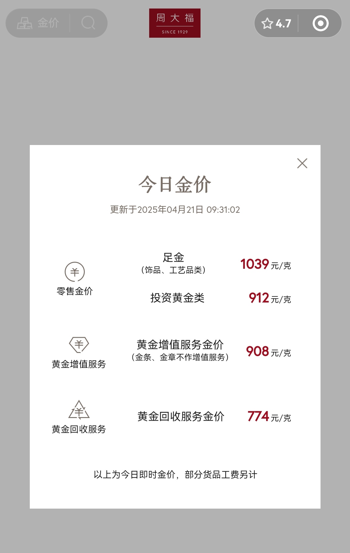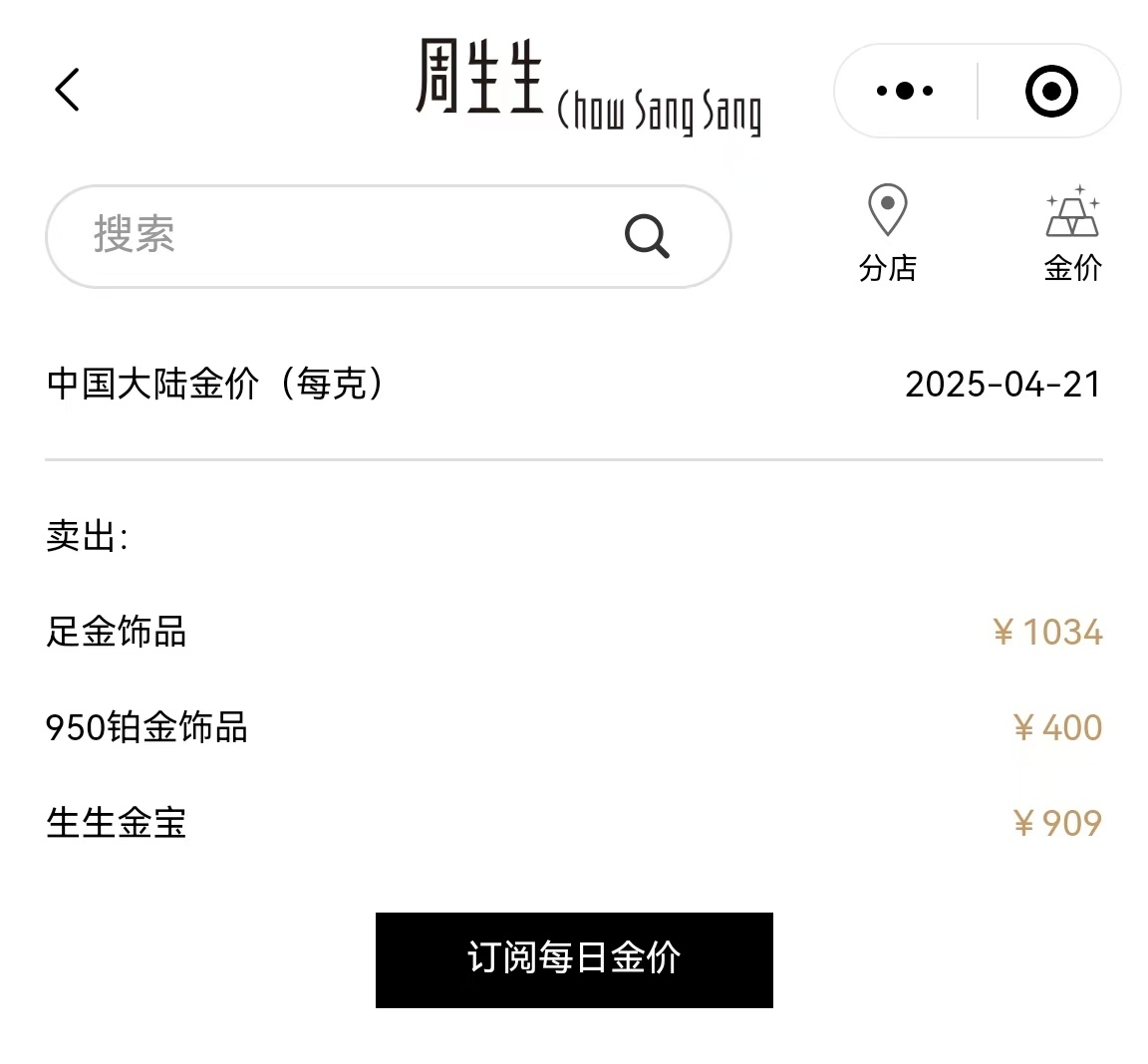 同花顺iFinD截图同时,国内多家黄金珠宝品牌首饰金价也随之水涨船高,截至发稿时,周大福金饰价格为1039元/克,周生生金饰价格为1034元/克,潮宏基金饰价格为1028元/克,老庙金饰价格为1038元/克(上海区域)。