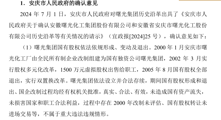 招股书显示,曙光集团前身为成立于1969年的安庆市曙光化工厂,此后曙光集团历经两次改革后由全民所有制企业变更为国有独自企业,并最终在2005年实现国有股权完成退出,变更为民营企业。