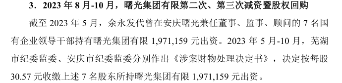 招股书还透露,截至2023 年5 月,余永发还代曾在安庆曙光兼任董事、监事、顾问的7 名国有企业领导干部持有曙光集团有限1,971,159元出资。不过由于上述人员涉及有关案件,2023 年 5 月-10 月,芜湖市纪委监委、安庆市纪委监委分别作出《涉案财物处理决定书》,决定按每股30.57 元收缴上述 7 名股东所持曙光集团有限 1,971,159 元出资。