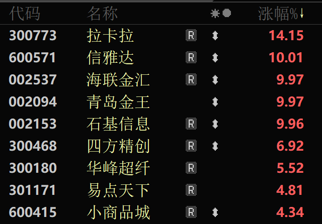 电子商务、数字货币、互联金融等相关板块也跟随上涨,跨境通、海能达、久其软件、生意宝等集体涨停。