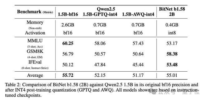 另外值得一提的是,BitNet b1.58 2B4T具有原生训练优势,与训练后量化(PTQ)模型对比,避免了PTQ常见的性能衰减