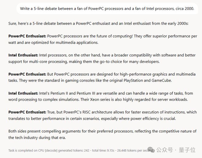 再让它基于2000年的背景,让一位PowerPC处理器爱好者和一位英特尔处理器爱好者进行五行辩论。