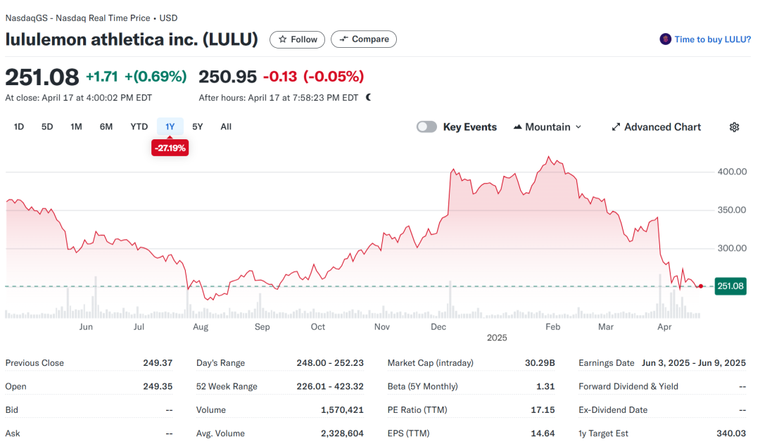 lululemon最近的股价正在狂泄。
