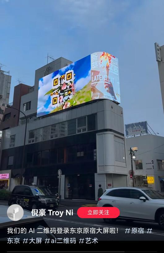 抱着这样的开发思路,倪豪花费几周训练模型,做出了这款AI生成式二维码。“QR BTF”的创新之处不在于追求技术上的“高智能”,而是让普通的二维码焕发艺术生命力,去满足多样化需求——这些个性化的艺术二维码不仅受到商家、品牌和线下店铺的追捧,甚至登上了东京原宿的巨型广告屏。